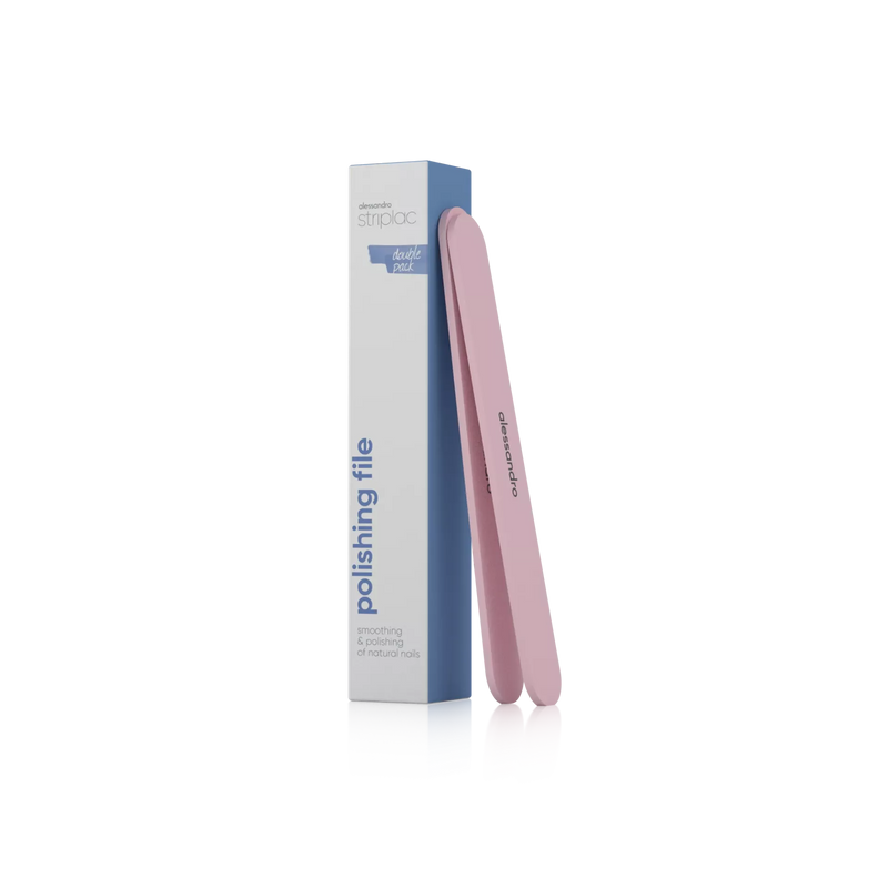 Nagels knippen, nagels vijlen, nagelriem achteruit duwen, dan zegt Alessandro dat je de nagels moet opblinken en gladder maken met een poliervijl, maar uit ervaring merk ik dat Striplac vaak langer blijft als je de nagels mat vijlt met een nagel buffer.