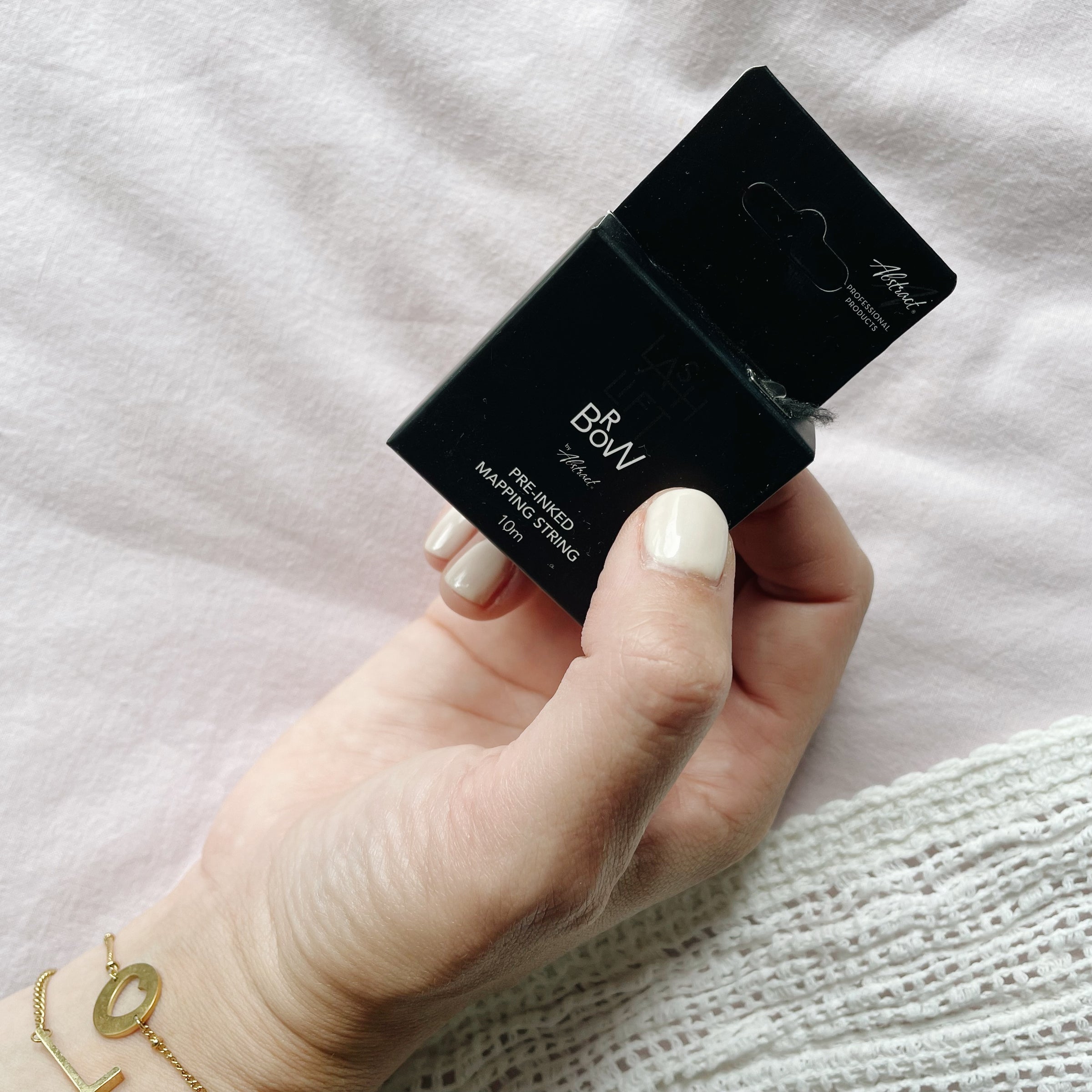 Handig touwtje voorzien van cosmetische inkt waarmee je gemakkelijk de wenkbrauwen kan afmeten en die een afwasbaar spoor achterlaat.